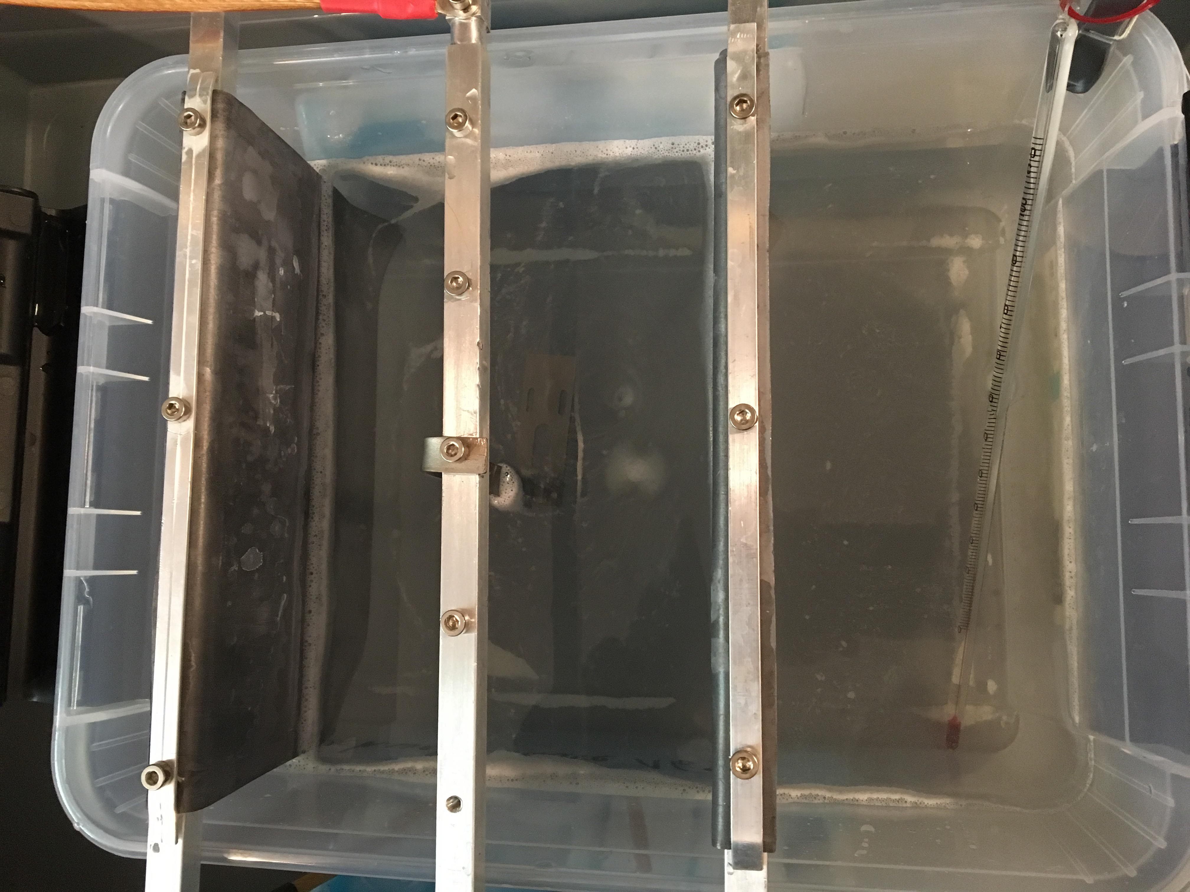 PP Wanne 24X31X15cm / 2 seitliche Kathoden: Bleiblech20X15cm,1,25mm doppelt gelegt, verschraubt auf Alustangen, außerhalb vom Bad.