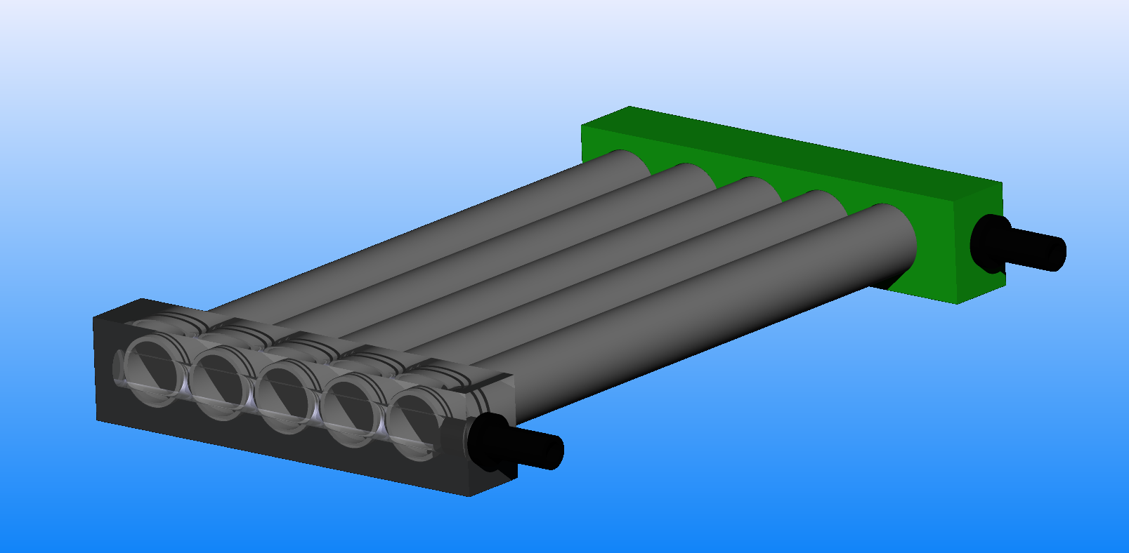 Und weil es mir gerade einfällt: Die Kühlrohre sollten besser nacheinander durchströmt werden (Serienschaltung), nicht gleichzeitig (Parallelschaltung). Im schlimmsten Fall steht die Wassersäule in vier Rohren still, und nur im fünften strömt's so richtig.