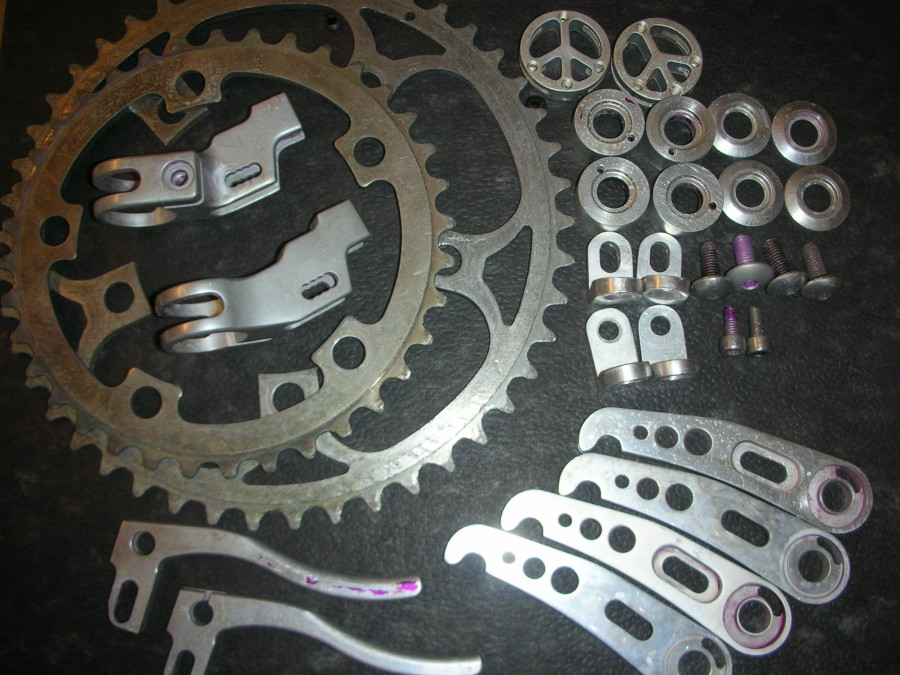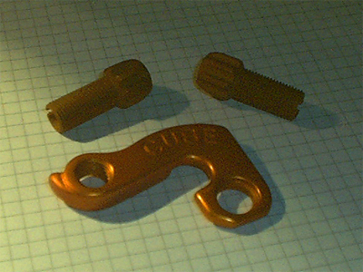 Zu sehen sind ein paar Bremsarme und Schellen für Schalthebel die vorher jeweils schwarz waren und mit NaOH abgebeizt wurden. Die neue Farbe ist Titan-Oliv.