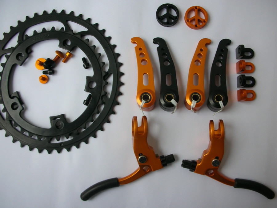 [hr]The following pictures show mountain bike parts anodised with our dyes deep black and orange by one of our customers.