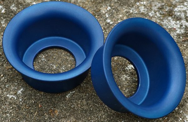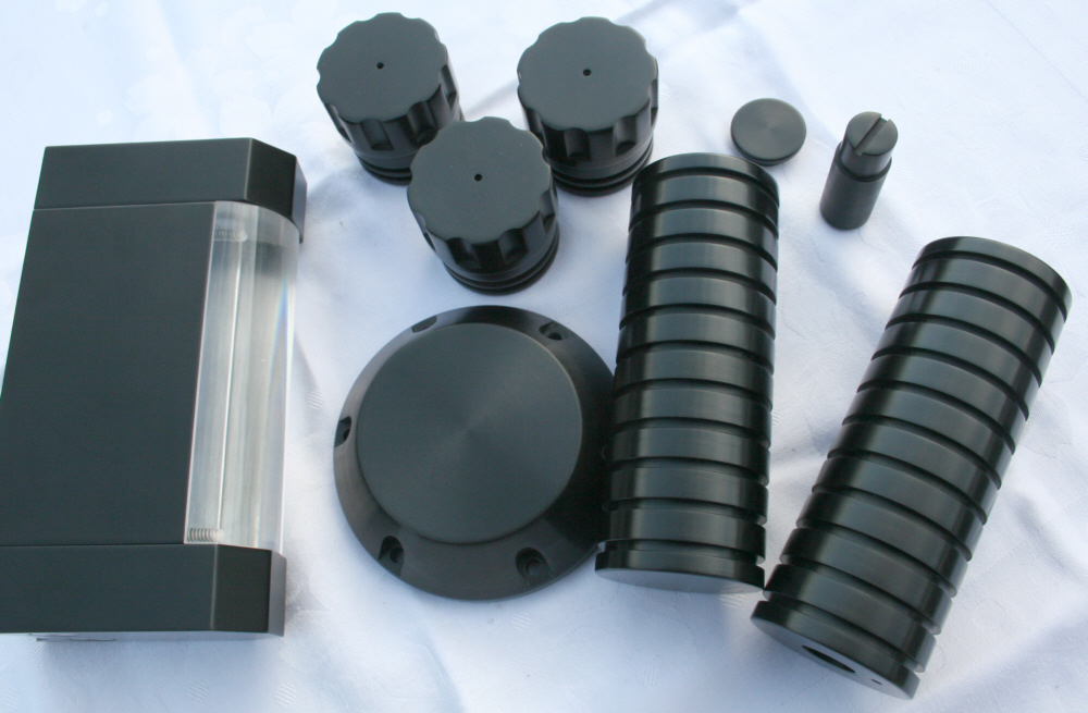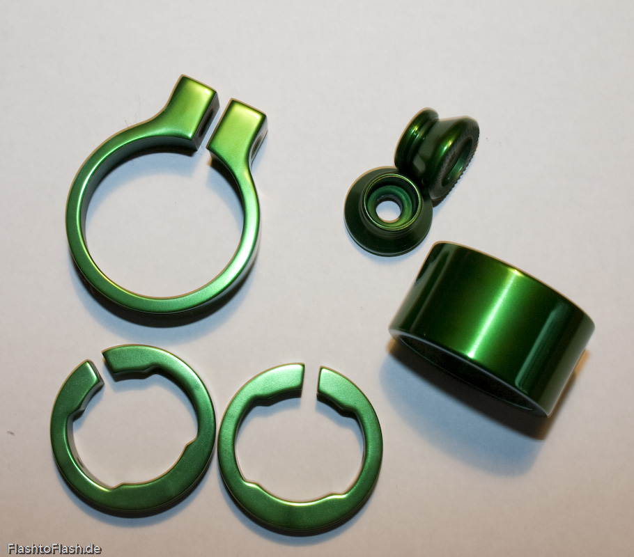 Die Teile wurden vorher mit Natronlauge entschichtet (die Reste der ursprünglichen violetten Eloxierung sieht man auf dem ersten Bild noch). Dieses Beizen sorgt für eine sehr ebene Oberfläche. (Tipp: das doppelte Anodisieren mit zwischenzeitlicher Entschichtung ist ein einfacher Trick, um blankere Oberflächen zu erzielen.)