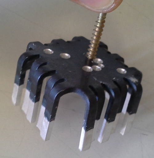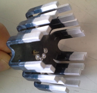 Als erstes hab ich mal eine Dose Erdnüsse verdrückt um ein elektrisch leitendes Gefäß zu bekommen. In das Gefäß kommt heißes Wasser und etwa ein halber Teelöffel Salz hinein, damit das Wasser elektrisch leitend wird. Dabei solll das Gefäß so groß sein, dass das zu enteloxierende Teil zum Rand einen Abstand von etwa 2cm hat. Es darf den Rand des Gefäßes nicht berühren, da es sonnst nach einiger Zeit zu einem Kurzschluss kommt. An die Nussdose kommt dann der Pluspol einer Stromquelle und an das Teil der Minuspol. Als Stromquelle benutzte ich ein regelbares Netzteil 10A/ 30VDC. Bei meinem Versuch mit dem Kühlkörper hatte ich eine Stromstärke von 1,8A bei 4,4VDC eingestellt und es dauerte etwa 10 Minuten bis das Teil schön blank war. Je höher die Stromstärke und je mehr Salz desto schneller geht der ganze Vorgang.