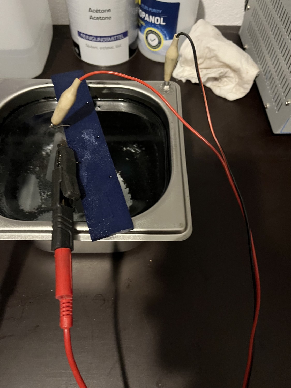 Was mir aber aufgefallen ist und mich etwas beunruhigt, ist die schwarz/grau Verfärbung meines Gastrobehälters, welchen ich als Eloxierbad/Kathode genutzt habe. Wie auf den Bildern zu sehen, bilden sich nach 3min schon die ersten schwarzen Flecken an der Kathode und nach 45min ist das ganze Bad überzogen. Danach habe ich das Bad sofort in einen Kunststoffbehälter umgefüllt (siehe Bildhintergrund) und die Säure ist nun eingegraut, trotz Filterung mit einem Kaffeefilter. Im Gastrobehälter bleibt ein schwarzer Belag, der sich aber wegwischen lässt.