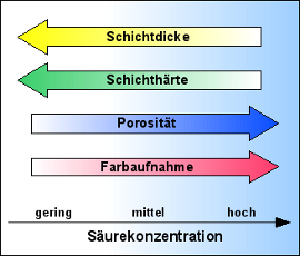 - The lower the acid concentration, the smaller the pores, the faster the layer grows, and the harder it becomes.