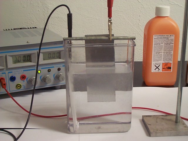 The image shows a very simple setup: aluminum sheets were attached to two short aluminum rods using the crocodile clips of the power supply. On the left, the cathode plate is suspended across the bath, connected to the negative terminal. In the center, the aluminum sheet to be anodized hangs as the anode, connected to the positive terminal. If you look closely, you can see the “mist” of tiny hydrogen bubbles rising from the cathode. During this shot, the current was 1.0 ampere.