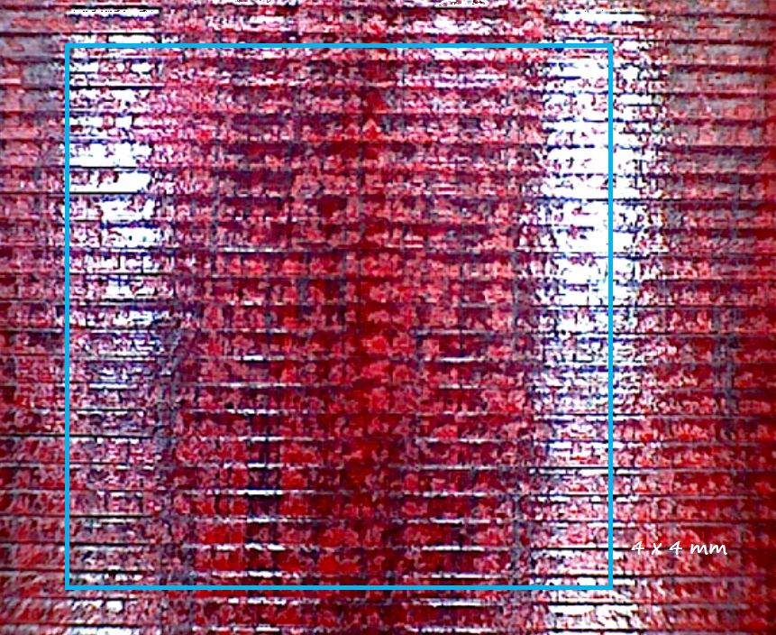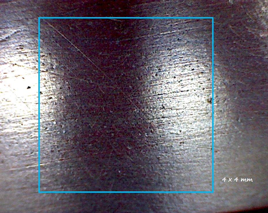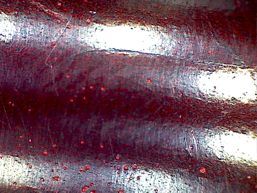 Die etwa 50fache Vergrösserung zeigt einige Fehler die mit bloßem Auge nicht auffallen. Allerdings traten die Streifen diesmal nicht auf, obwohl man im Bild 10 deutlich die "Spanbruchstellen" sieht. Vielleicht hat dieses Phänomen auch eine andere Ursache.