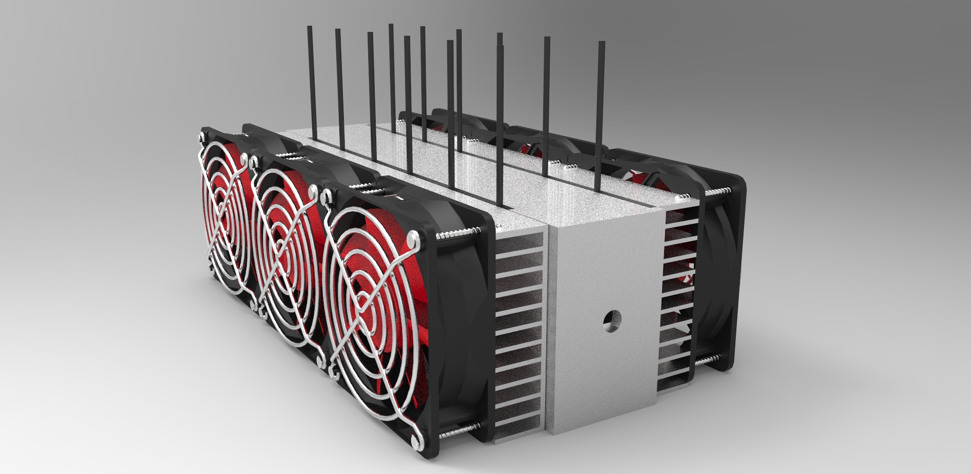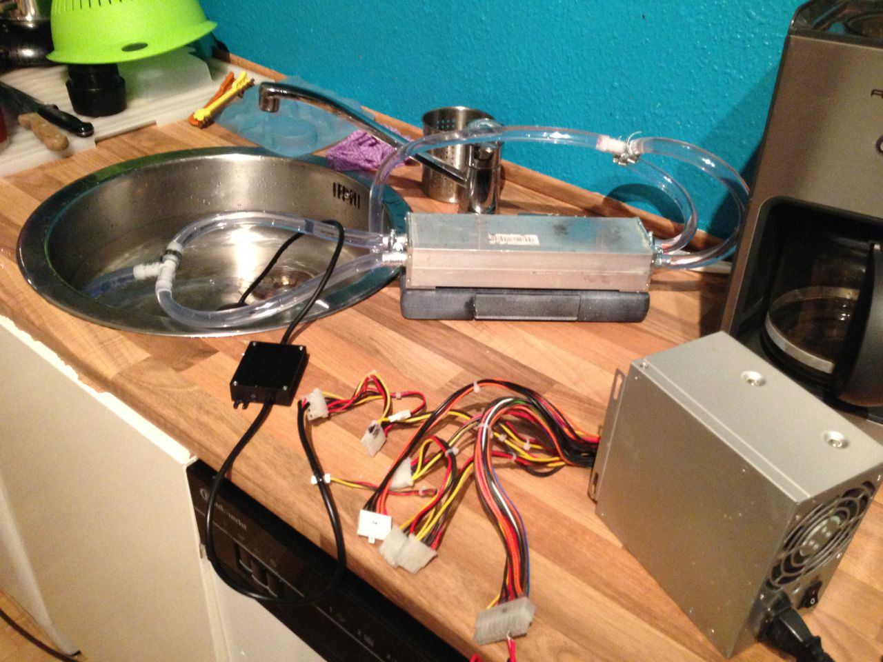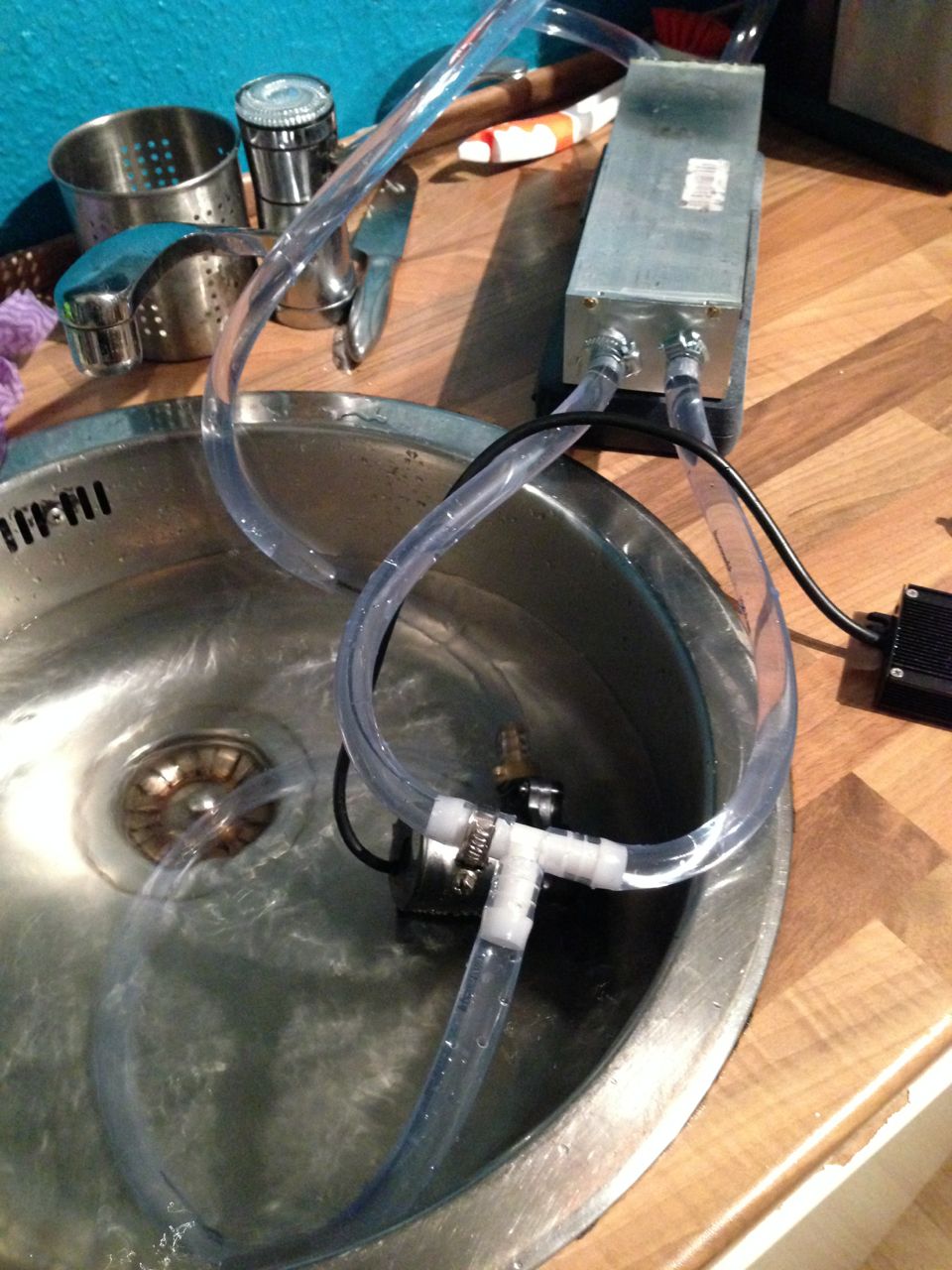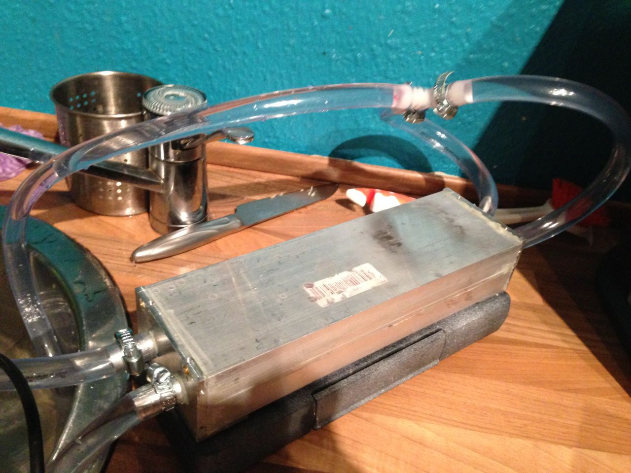 ich habe Alubleche passend zugeschnitten und mit den 2 anderen Kühlprofilen verklebt, dass alles dicht ist (mehr oder weniger...das hat noch Optimierpotential). An sich ist es das selbe Prinzip, wie mit den inneren Kühlrippen. Zwei Löcher gebohrt und Alurohre eingeklebt. Dann schließlich Schläuche mit Schlauchschellen verbunden und an eine zweite nicht so leistungsstarke Pumpe dran PUMPE .