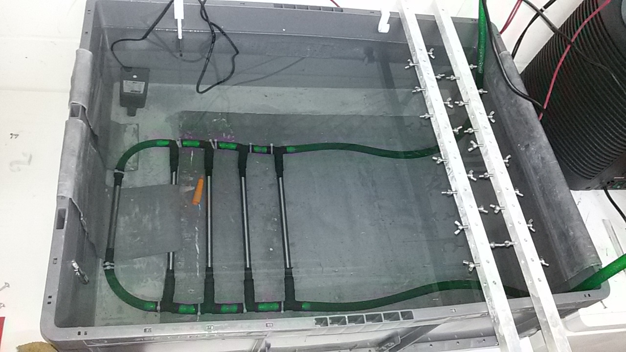 Die Titanrohre bleiben natürlich erhalten. Man nimmt anstatt einer Schlange aber einfach mehrere gerade Rohrstücke, die man dann jeweils über 8mm-Schlauchstückchen rechts und links an die T-Stücke anschließt. Und die T-Stücke rechts und links verbindet man wiederum senkrecht über 12mm-PVC-Schläuche untereinader und schließlich das eine Ende mit der Pumpe und das andere mit dem Bad. Insgesamt sieht das dann aus wie eine Art Heizkörper: die Rippen werden von den Titanrohren gebildet und die Verbindungen zwischen den Rippen von den T- und Schlauchstücken.