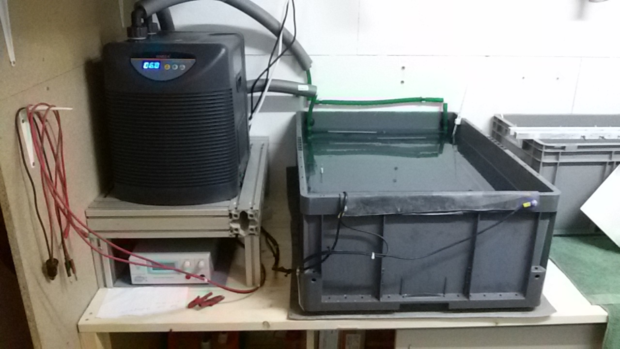 Grundsätzlich ist so ein Aufbau eine gute Idee, die man auch im semiprofessionellen Bereich anwenden kann: eine einfache Gefriertruhe wird mit einem passenden Tank/Kanister und Kühlmittel mit bspw. Kühlerfrostschutz versehen. Der Wärmetauscher befindet sich dann z.B. im Kanister und man pumpt den "heißen" Elektrolyt hindurch und danach wieder ins Bad.