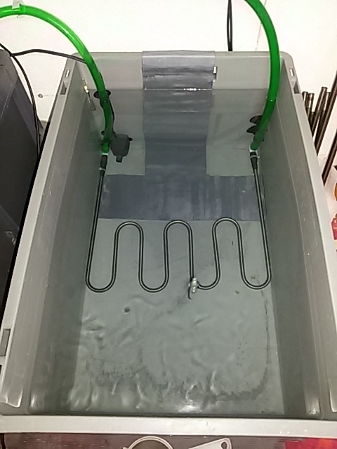 Während meine "alte" Kühlschlange aus einzelnen Titanröhrchen bestand und das grosse Becken so gekühlt hat das ich meine ganze tägliche Freizeit mit eloxieren verbringen konnte, reicht die für 2 Becken nicht mehr aus. Mein Plan war nämlich die Kühlschlange durch beide Becken zu führen und keinen zusätzlichen Hailea zu kaufen. Da dieses vorhaben so nicht geklappt hat musst eine bessere Wärmeabfuhr her damit das ursprüngliche Vorhaben so passt.